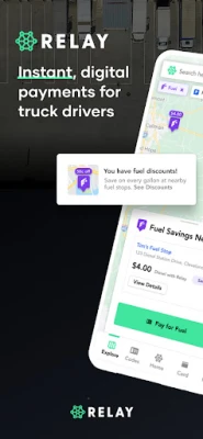 PAY LESS FOR FUEL: Instantly use Relay’s cardless digital payments to purchase fuel along your route. Relay's innovative payment solution ensures complete pricing transparency, requires no lengthy activations or card applications, and can provide substantial fuel discounts at participating truck stops.